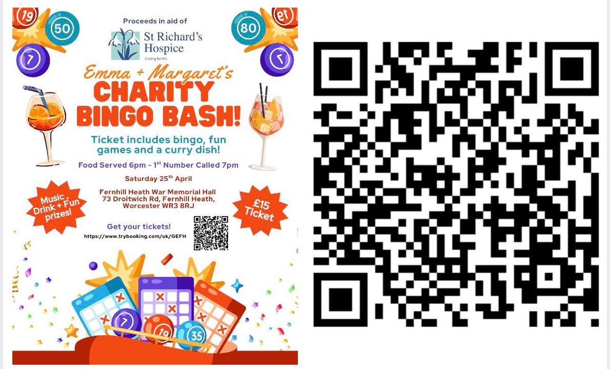 PLEASE READ & SUPPORT We’re supporting this as a favour to our favourite post office worker - even though it’s happening at a club up the road! Here’s a message from Emma & Margaret…👇🏻 Helllloooo! We’d love to invite you and your chosen guests to join us at our fun charity Bingo Night. St Richard’s Hospice is a charity we will forever be grateful to and would like to continue to support for those who may need it in the future. We have just opened the ticket booking online service. Please click on today to secure your place. It’s going to be an enjoyable evening for all xx Thank you x Emma & Margaret Click on the QR Code and support this fantastic event! Matt and The Team The White Hart, Fernhill Heath.